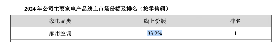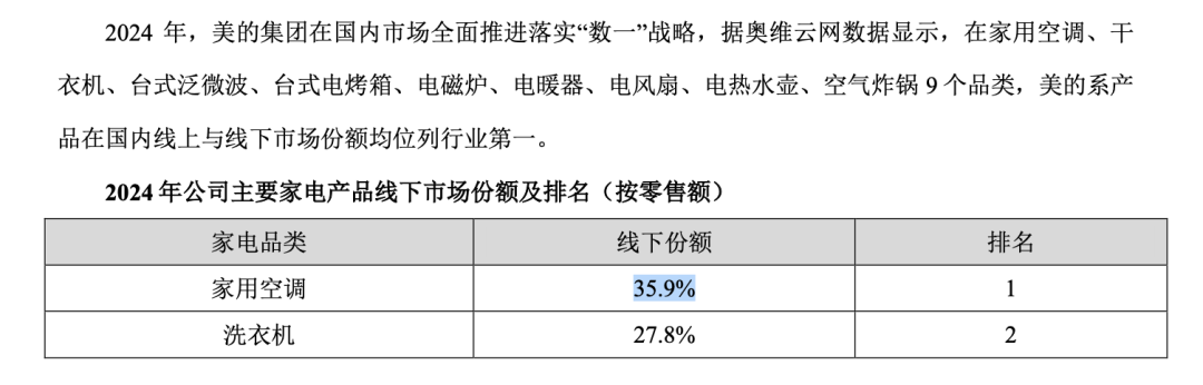 美的集团同样援引奥维云网的数据,在9个品类中,美的系产品2024年在国内线上与线下市场份额均位列行业第一。其中家用空调的线下市场份额为35.9%,排名第一;家用空调的线上市场份额为33.2%,排名第一。美的集团在财报中同样是“按零售额”进行呈现。