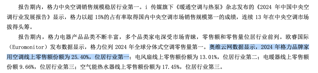 格力电器除了援引相关行业杂志的数据,称格力电器在国内中央空调市场连续13年拔得头筹外,还援引奥维云网数据,2024年,格力品牌家用空调线上零售额份额为25.40%,位居行业第一。